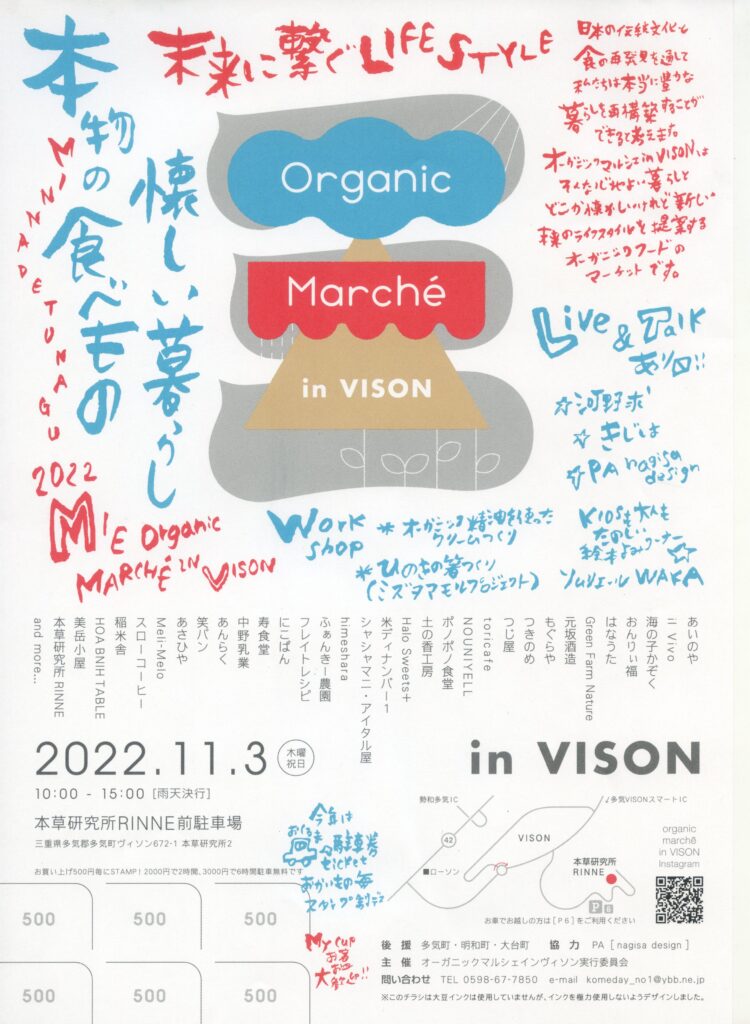 日本の伝統文化と食の再発見をとおして、ほんとうに豊かな暮らしをと願い、ひらかれる「オーガニックマルシェ」。懐かしくて新しいオーガニックフードがたっぷり集まります。今回はチラシにスタンプコーナーがあり、お買い上げ五百円ごとに押印されて、駐車料金が軽減(無料)されるしくみになってます。11月3日(祝日)です。