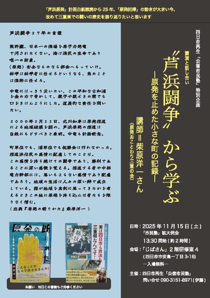 投稿日: 2025年10月30日2025年10月30日”芦浜闘争”から学ぶ ー原発を止めた小さな町の記録ー 『原発の断りかた』の著者である柴原洋一さんが講師として招かれ、お話・意見交換など、貴重な催しが開催されます。ぜひご参加ください。